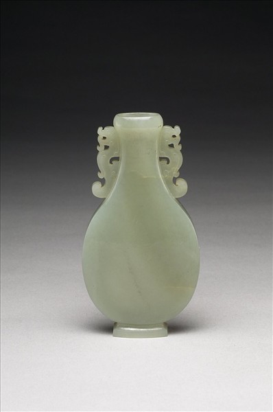 青玉,玉色青白質潤,略有瑕紋。橢圓口,圓腹,附鏤雕雙龍耳,圈足。器作扁圓形,器身光素無紋。瓶是用來放置香筷及香鏟,與香爐、盒三件成組。