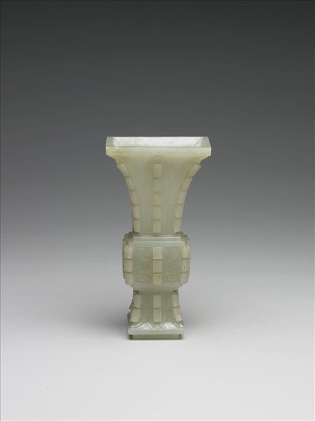 玉質。器形仿青銅器方形尊。器分三段裝飾,各有八扉棱;上下均雕飾蕉葉紋,器腹則為獸面紋。瓶與爐、盒三件一組,同為焚香之成套器具。