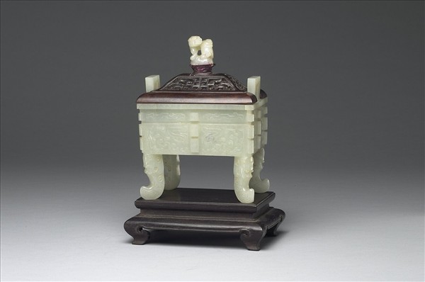 玉質。器形仿青銅方鼎,雙立耳,四獸足。扉棱與口緣均以回紋為飾,器腹飾獸面紋。帶獸形玉頂紫檀木蓋,玉頂為明清作品。爐與瓶、盒三件一組,同為焚香之成套器具。