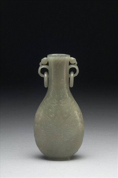 玉質。雕兩含苞番蓮為提耳,皆帶活環,器腹正中雕飾一番蓮,枝葉蔓生而幾乎滿布全器,顯見製作者以番蓮母題統一全器風格的用心。是器與爐、盒三件一組,同為焚香之成套器具。