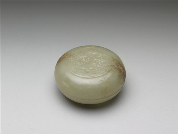 玉質。平頂蓋,子母口,弧形壁,盒蓋圓形開光雕靈芝為飾,器身則光素無紋。與瓶、爐三件一組,同為焚香之成套器具。