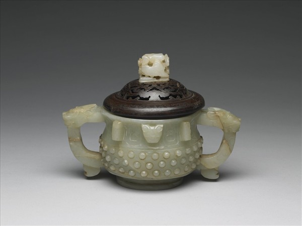 青灰玉,器形仿三代青銅簋形器,但已用作香爐。圓口碩腹,兩提耳立雕獸首,作張口吞噬鳥首模樣,但已簡化變形,不易辨識了。器腹上半中央琢有獸首與象徵扉棱的方形凸起,器腹下半則琢乳丁為飾。清宮中加配嵌有銀絲之紫檀木蓋。是器與瓶、盒三件一組,同為焚香之成套器具。