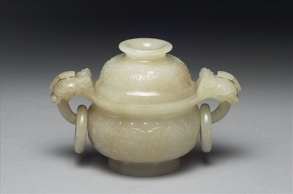 玉質。圈足,蓋有鈕,提耳各雕一獸,皆帶活環。器腹與器蓋略鼓起,皆以大片獸面紋為飾,與外張突出器耳形成了整體大方的氣質。與瓶、盒三件一組,同為焚香之成套器具。