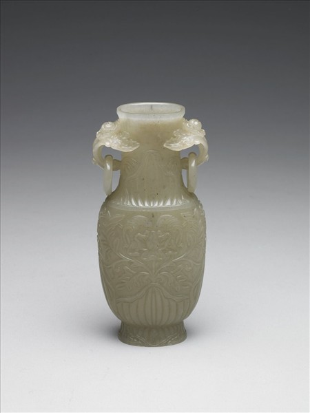 玉質,帶灰黑斑點。橢圓口,長頸,扁腹,圈足外撇。瓶頸兩側雕飾兩帶環彎曲荷葉,耳上有蓮苞;器腹則飾兩折枝番蓮,器頸、底邊及圈足各飾轉折荷葉一周。瓶與爐、盒三件一組,同為焚香之成套器具。