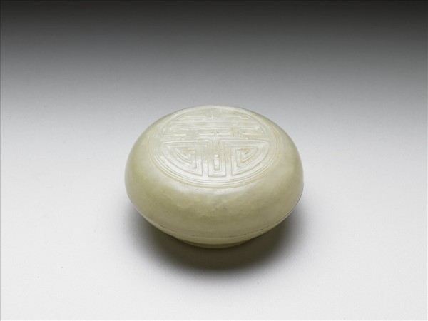 青玉,略有瑕紋。圓形盒,子母口,捲足,蓋面雕飾幾何形「壽」字紋。器身則光素無紋。盒與瓶、爐三件一組,同為焚香之成套器具。