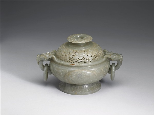 灰玉質,略有瑕。圓口碩腹,兩提耳雕飾帶口啣活環雙龍紋,器腹則飾變形獸面紋。器蓋與蓋鈕皆鏤雕纏枝蓮紋,器蓋鏤空處,可讓薰香煙氣緩緩透出。與瓶、盒三件一組,同為焚香之成套器具。