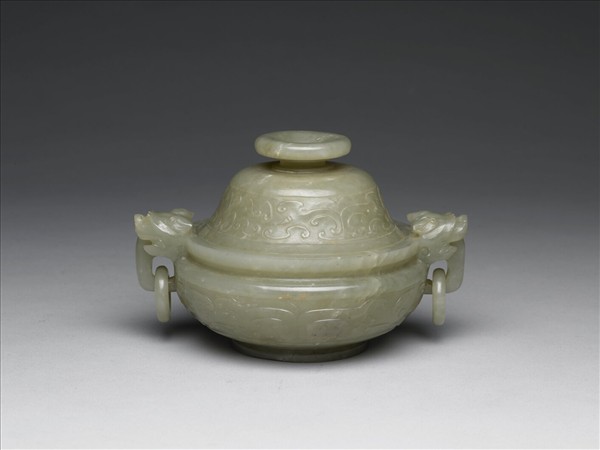 灰玉質。圓口碩腹,圈足。器耳立雕兩獸首啣環,腹、蓋飾獸面紋。與瓶、盒三件一組,同為成套焚香用器。