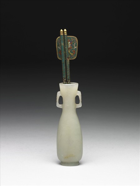 玉質,有黃色瑕斑。扁瓶,侈口,長頸,深腹,圈足。器腹兩側有一方形耳,耳上各有兩道淺斜紋。通體光素無紋。瓶與爐、盒三件一組,同為焚香之成套器具。