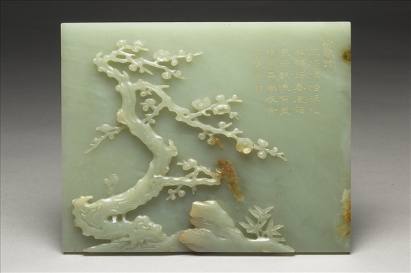 青玉質,帶橘黃沁染。插屏呈長方形,一面雕琢菊花填金;另一面則浮雕湖石、梅花及幼竹一叢,右上角鐫刻描金隸書乾隆御製七言詩一首:「玉梅標格稱仙粧,頭踏春風領眾芳,設使東皇編甲第,南枝合作樑華郎。」此詩獨標舉梅花一色,正與此器以梅樹為雕飾主題的狀況相切合。