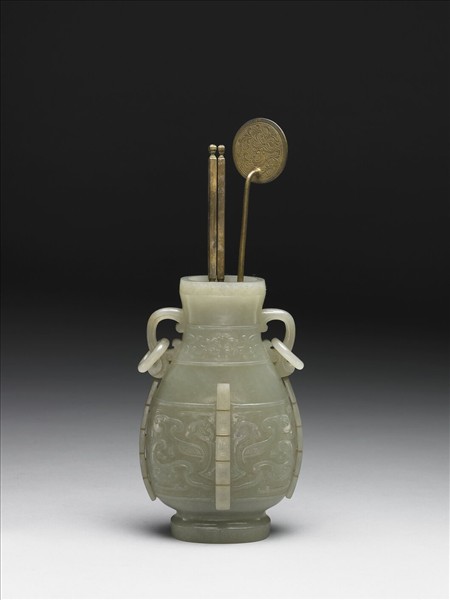 玉質,仿青銅壺造型。扁圓形略帶灰白斑,短頸,碩腹,圈足略高,雙耳帶活環。器頸淺浮雕略呈幾何的對稱鳥紋;器腹則雕飾獸面紋,以回紋為地,其上雕四條出戟棱脊。瓶為香具,用來插置香箸及香鏟,與香爐、香盒三件一組。附鎏金銅鏟及銅箸。