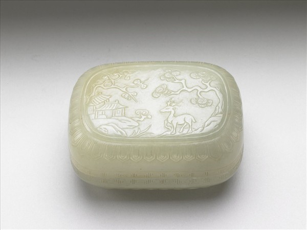 玉質,有瑕紋。橢圓形盒,子母口。蓋面長方形開光,內淺雕松、鹿、靈芝等吉祥圖案,蓋四周則是變形蓮瓣紋一周。盒為香具,收納香品,與香爐、香瓶三件一組。
