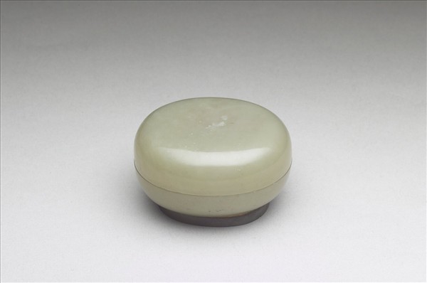 玉質,帶灰白斑。圓盒,子母口,圈足。全器光素無紋。盒為香具,收納香品,與香爐、香瓶三件一組。