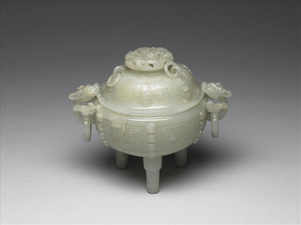 玉質,帶灰白斑及瑕斑,仿銅鼎造型。圓爐,三足,器耳為龍首,下帶活環,帶蓋。器腹及蓋淺浮雕獸面紋,各有六道棱脊;蓋上有三繫帶活環,蓋鈕鏤雕盤龍紋。爐為香具,與香瓶、香盒三件一組。