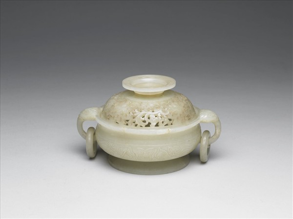 玉質,帶黃赭色瑕斑。圓爐,雙獸耳,下接活環,圈足,帶蓋。器腹琢飾雙龍紋,器蓋鏤雕番蓮紋,間隙滿佈卷草紋,有鈕,鈕上飾扭絲紋。爐為香具,與香瓶、香盒三件一組。