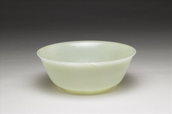 玉質,略有瑕。碗侈口,深壁,圈足。全器光素無紋。底刻「乾隆年製」四字隸款。