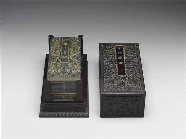 青玉十片,雙面陰刻填金,第一片正面雕標題「御筆十全記」,兩側雕對龍,下方雕壽山福海,第十面背面下方雕壽山福海,上方刻朵雲昇龍,中間的玉片正反面為清高宗於乾隆五十七年(1792)所寫的十全記全文,刻行楷體,筆鋒尖出頗多。內容講述乾隆朝中兩次平定準噶爾,一定回部,二掃金川,平定臺灣,降緬甸、安南,二次受廓爾喀降合的十次戰功,清高宗並以此自詡「十全老人」,文中提及第二次接受廓爾喀降合之始末,並自比唐太宗,文後進一步警惕後世繼任君主不可輕言修文偃武,以致棄其固有,不能守國。整套玉冊側面刻有一至十的編號,以一木盒收存。