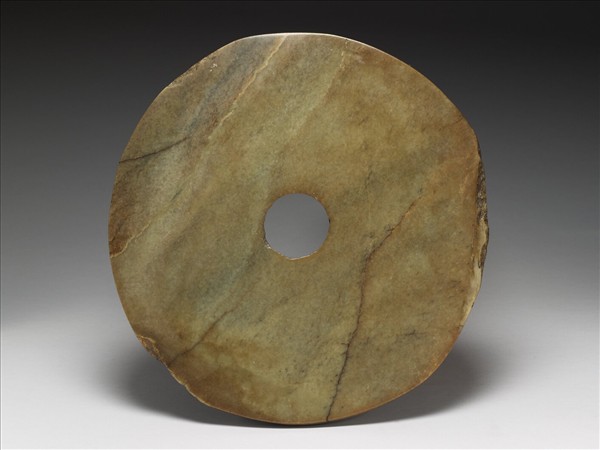 灰青帶褐色玉質,有黑砂點雜斑,玉質尚稱純勻。不甚圓的璧形,器面伏鼓不平整,厚薄不一,外緣多處崩傷,一面有一首較淺的折線切割痕,中孔甚小,單面鑽。