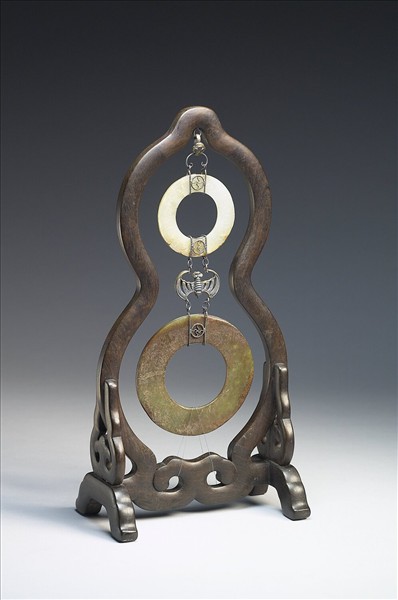 《長物志》一書中或有將古銅鐘及古玉石磬作為陳設。相同的概念下,這件明〈紫檀壺盧式雙玉璧屏〉巧妙串聯周代以前上古的兩件大小玉璧,配以紫檀木座,製成壺盧形立屏,將古玉淳樸的美感轉化成優雅靈透的文人氣息。