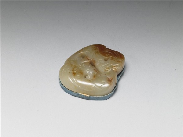 青白玉質,局部受沁呈褐色。全器近橢圓不規則形,一面淺雕獸頭,身形蜷曲,以陰線刻劃面部輪廓及身體裝飾線條。雕刻線條簡單流暢。