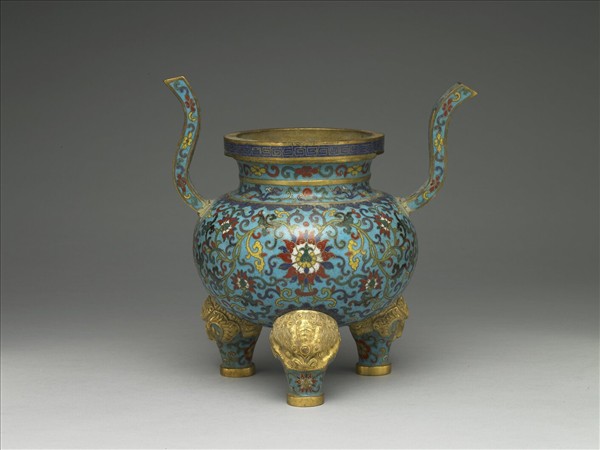 銅胎。直口,豎邊,短頸,圓腹,雙板形耳,圓底,嵌飾鍍金獸面三足。以掐絲技法、琺瑯料填色制作花紋,口沿飾深藍地回紋,其餘皆為淺藍地,頸部飾海棠花紋及雙夔龍拱珠紋,下接一圈如意雲紋邊飾,腹部及底部飾纏枝番蓮紋,足身飾番蓮紋及葵花紋。外底部露胎,有鏨刻「乾隆年製」雙行楷書雙方框款。香爐為五供之一,本器與中琺4-7成套。