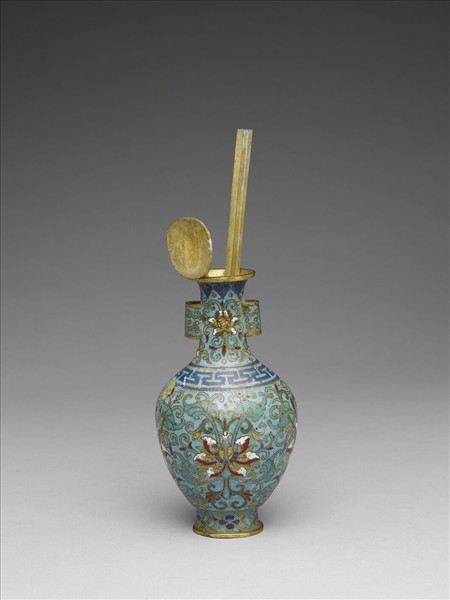 微撇口,直頸,雙貫耳,斜肩,斂腹,撇圈足。全器淺藍地,以掐絲技法於口緣飾如意雲紋,頸與腹飾番蓮紋,肩飾回紋,足飾海棠紋。附圓形銅鏟一,銅箸一雙。中琺21、22、23為一組。