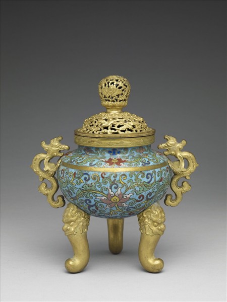直口,短頸,雙螭型耳,斜肩,鼓腹,三張口龍足,鏤空雲紋蓋,蓮瓣座鏤空蓮花紋鈕。全器淺藍地,以掐絲技法於肩與腹飾轉枝番蓮紋,頸飾海棠紋。