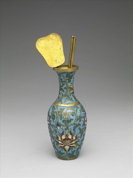 微撇口,長頸,斜肩,斂腹,平底。全器藍地,以掐絲技法於器表飾轉枝番蓮紋。附芭蕉葉形銅鏟一,銅箸一雙。
