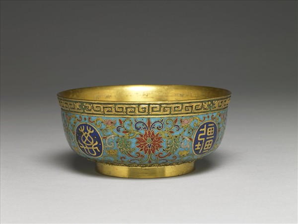 口微撇,深壁,圈足。器身紋飾以掐絲技法完成,器表淺藍地,四圓形開光平均分列,內各有一深藍地篆體金字:「萬」、「壽」、「無」、「疆」,開光隙地各飾一組五彩轉枝番蓮紋。腹底與口緣紋飾以內填琺瑯技法完成,腹底飾一圈綠地鑄飾蓮瓣紋,碗緣飾綠地鍍金製拐子龍紋邊飾。底陰刻「子孫永寶」四字雙行雙方框篆款。