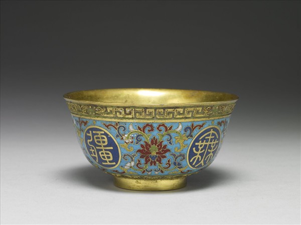 口微撇,深壁,圈足。器身紋飾以掐絲技法完成,器表淺藍地,四圓形開光平均分列,內各有一深藍地篆體金字:「萬」、「壽」、「無」、「疆」,開光隙地各飾一組五彩轉枝番蓮紋。腹底與口緣紋飾以內填琺瑯技法完成,腹底飾一圈綠地鑄飾蓮瓣紋,碗緣飾綠地鍍金製拐子龍紋邊飾。底陰刻「子孫永寶」四字雙行雙方框篆款。
