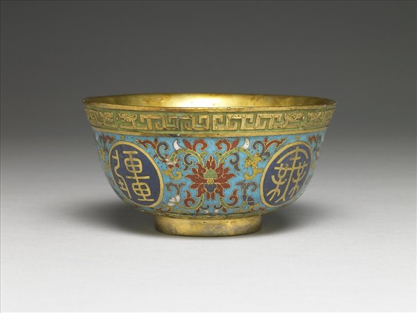口微撇,深壁,圈足。器身紋飾以掐絲技法完成,器表淺藍地,四圓形開光平均分列,內各有一深藍地篆體金字:「萬」、「壽」、「無」、「疆」,開光隙地各飾一組五彩轉枝番蓮紋。腹底與口緣紋飾以內填琺瑯技法完成,腹底飾一圈綠地鑄飾蓮瓣紋,碗緣飾綠地鍍金製拐子龍紋邊飾。底陰刻「子孫永寶」四字雙行雙方框篆款。