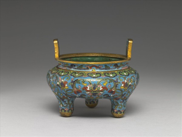 鍍金口,雙立耳,短頸,扁圓腹,平底,三足。全器以淺藍色為地,以掐絲技法於頸部飾拐子龍紋,腹部上緣及圈足周圍飾一圈如意雲紋,腹、足部飾纏枝番蓮紋,底部飾葵花紋及簡化番蓮紋。中琺54、55、56為一組。