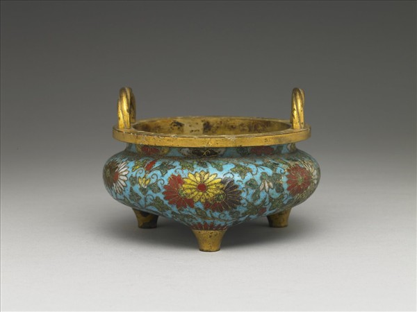 鍍金口,雙立耳,短頸,扁腹,平底,三足。全器紋飾以掐絲琺瑯技法完成,淺藍地,頸部飾一圈朵雲紋,腹部有四組菊花紋,隙地飾纏枝花葉紋,底部飾菊花紋及纏枝朵花紋,足部露胎,上緣飾菊瓣紋。中琺63、64、65為一組。