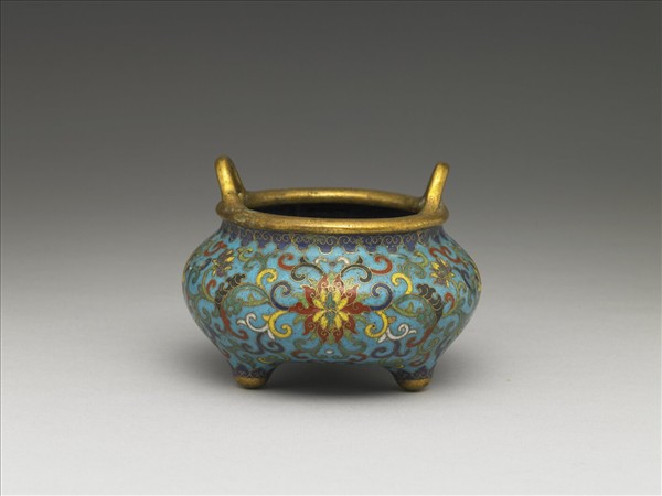 唇口,雙立耳,短頸,扁腹,圓底,三足。全器紋飾以掐絲琺瑯技法完成,淺藍地,口沿下緣及足上緣飾一圈如意雲紋,腹部飾纏枝番蓮紋,底飾六瓣花紋。底有方形露胎,內陰刻「乾隆年製」橫向單行楷款,及一「城」字。中琺66、67、68為一組。