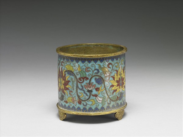 鍍金口,筒腹,平底,三如意雲板形足。全器紋飾以掐絲琺瑯技法完成,淺藍地,口沿下緣及腹下緣飾一圈如意雲紋,腹飾轉枝番蓮紋,底飾六瓣花紋。底有方形露胎,內陰刻「乾隆年製」橫向單行楷款,及一「陰」字。中琺72、73、74為一組。