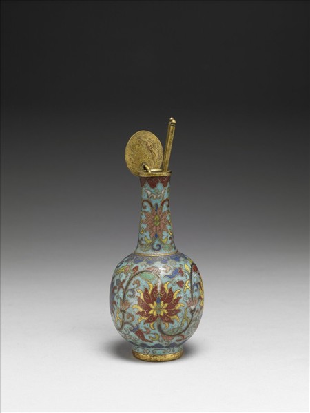鍍金口,長頸,圓腹,圈足。全器以掐絲琺瑯技法完成,淺藍地,口沿下緣及腹上下緣各飾一圈如意雲紋,頸飾番蓮紋,腹部為轉枝番蓮紋,圈足飾掐絲幾何紋。底有陰刻「乾隆年製」橫向單行楷款,及一「陰」字。附圓形銅鏟一只,銅箸一雙。中琺72、73、74為一組。