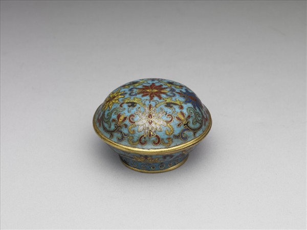 蒸餅式,子母口,圈足。全器紋飾以掐絲琺瑯技法完成,淺藍色為地,飾掐絲番蓮紋,圈足飾幾何紋。底有陰刻「乾隆年製」橫向單行楷款,及一「陰」字。中琺72、73、74為一組。