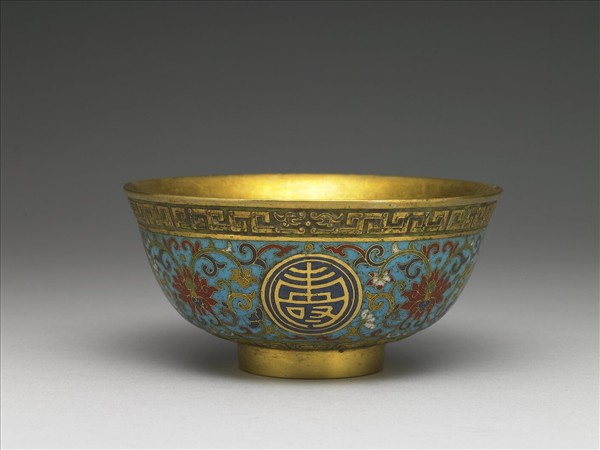 口微撇,深壁,圈足。器身紋飾以掐絲琺瑯技法完成,器表淺藍地,四圓形開光平均分列,內各有一深藍地篆體金字:「萬」、「壽」、「無」、「疆」,開光隙地各飾一組五彩轉枝番蓮紋。腹底與口緣紋飾以內填琺瑯技法完成,腹底飾一圈綠地鑄飾蓮瓣紋,碗緣飾綠地鍍金製拐子龍紋邊飾。底陰刻「子孫永寶」四字雙行雙方框篆款。