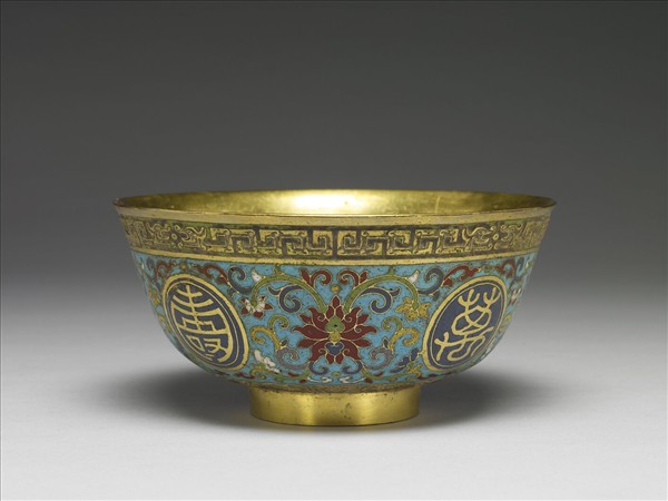 口微撇,深壁,圈足。器身紋飾以掐絲琺瑯技法完成,器表淺藍地,四圓形開光平均分列,內各有一深藍地篆體金字:「萬」、「壽」、「無」、「疆」,開光隙地各飾一組五彩轉枝番蓮紋。腹底與口緣紋飾以內填琺瑯技法完成,腹底飾一圈綠地鑄飾蓮瓣紋,碗緣飾綠地鍍金製拐子龍紋邊飾。底陰刻「子孫永寶」四字雙行雙方框篆款。
