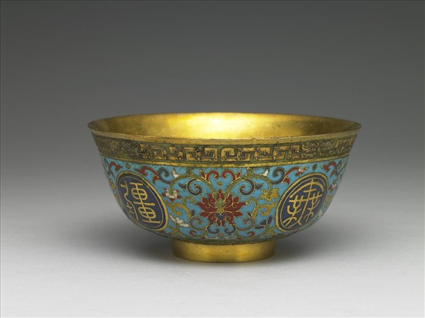 口微撇,深壁,圈足。器身紋飾以掐絲琺瑯技法完成,器表淺藍地,四圓形開光平均分列,內各有一深藍地篆體金字:「萬」、「壽」、「無」、「疆」,開光隙地各飾一組五彩轉枝番蓮紋。腹底與口緣紋飾以內填琺瑯技法完成,腹底飾一圈綠地鑄飾蓮瓣紋,碗緣飾綠地鍍金製拐子龍紋邊飾。底陰刻「子孫永寶」四字雙行雙方框篆款。