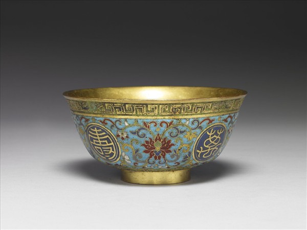 口微撇,深壁,圈足。器身紋飾以掐絲琺瑯技法完成,器表淺藍地,四圓形開光平均分列,內各有一深藍地篆體金字:「萬」、「壽」、「無」、「疆」,開光隙地各飾一組五彩轉枝番蓮紋,腹底與口緣紋飾以內填琺瑯技法完成,腹底飾一圈綠地鑄飾蓮瓣紋,碗緣飾綠地鍍金製拐子龍紋邊飾。底陰刻「子孫永寶」四字雙行雙方框篆款。