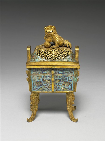 四方形,侈口,折沿,雙立耳,深壁,平底,四螭形足,帶鏤空番蓮紋盝頂式蓋,戲球獅鈕。外壁四邊及四角各有一出脊,以淺藍地掐絲琺瑯為飾,蓋四角飾番蓮紋,外壁上為對夔龍紋,下方為獸面紋,底由兩黑色對角線分割成四塊,內側飾如意雲紋,外側飾回紋。中琺133、134、135為一組。