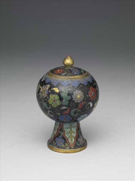 子母口,圓腹,高圈足微撇,子母口蓋,蓮瓣座鈕。全器黑地,以掐絲技法於鈕旁飾一圈葉紋,口緣及足底各飾一圈如意雲紋,腹飾番蓮紋,圈足上方飾蕉葉紋與幾何紋。