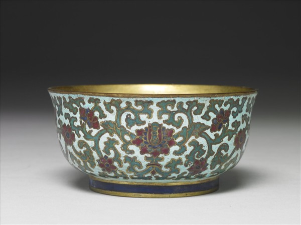 微撇口,深壁,圈足,全器淺藍地,以掐絲技法於器表飾番蓮紋,足飾一圈深藍環帶紋。