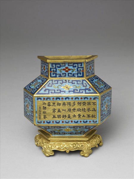 銅胎,前面為四角形口,折肩,直腹,底平,連接浮雕花卉紋如意雲足座,靠牆面平,頸下方有一孔可以直接掛在牆面的釘上,故稱壁瓶,清檔中稱之轎瓶。此型器始見於明萬曆朝,清代盛行於乾隆時期。全器淺藍地,以掐絲技法於頸、肩與側腹、下腹飾拐子龍紋與各式花紋,腹正面飾幾何紋,開光鍍金地,填陰刻填墨隸書詩文「不為秋風花不黃,棱上何礙葉多芒。向陽原是無心好,鄒孟因思第五章。 御題秋葵 子臣永璇敬書」永璇(1746-1832),乾隆皇帝第八子,書法趙孟頫。