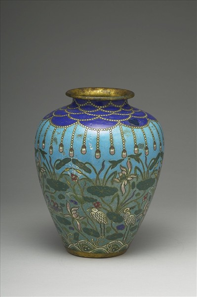 銅胎,唇口,短頸,豐肩,斂腹,底略內凹。頸肩寶藍地垂珠串纓絡,腹飾荷塘紋,包括荷花、水蠟燭、鷺鷥、鴛鴦及水紋等。就紋飾風格和釉色,應屬十八世紀後期的文物。