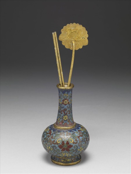 侈口,長頸,碩腹,撇足。器身淺藍地,以掐絲技法製作花紋。頸卷枝花卉,上下各有如意雲頭紋一圈。腹部滿飾纏枝番蓮紋,上下亦各有如意雲頭紋一圈。圈足露胎,足內刻「大清乾隆年製」、「慕」字楷款。附香剷一支,銅筷一對。本器與他件瓶、爐共成「爐瓶盒三件」。