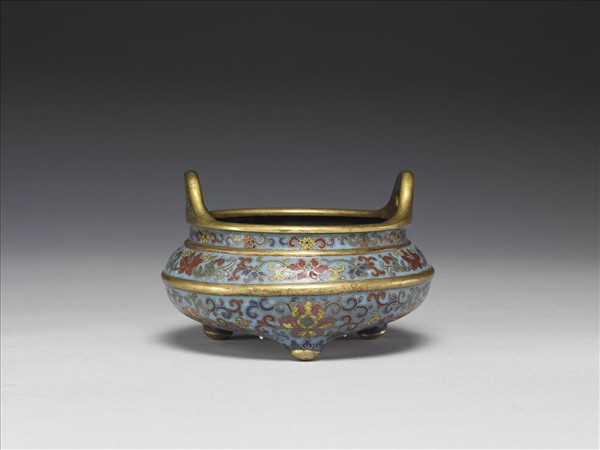 銅胎,圓口,短頸,碩腹,三足,雙立耳。器身淺藍地,以掐絲技法製作花紋,頸部卷枝花卉,腹外壁被露胎凸棱等分為上下兩部分,惟均以卷枝番蓮紋為飾。底外卷枝花圍繞方形露胎,上刻「大清乾隆年製」、「慕」字楷款。本器與他件瓶、盒共成「爐瓶盒三件」。