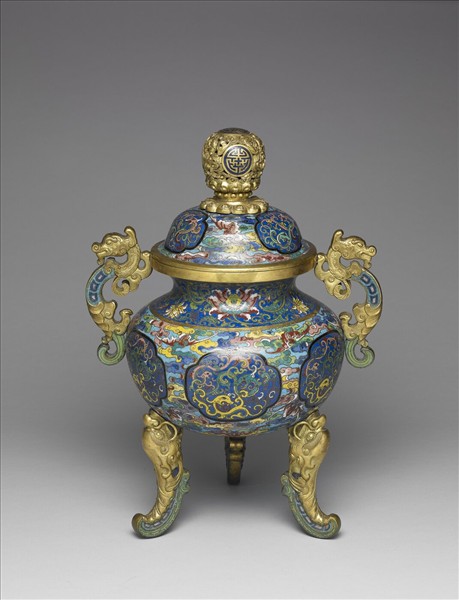 銅胎,盤口,束頸,豐肩,碩腹下斂,雙龍耳,三龍足。蓋面與器壁均以掐絲製作花紋。蓋雕飛蝠向壽為鈕,鈕下鏨蓮瓣,蓋面四開光,開光內拐子龍,開光外則蝙蝠飛舞於雲間。頸部卷枝番蓮紋,腹外壁裝飾與蓋面類同,同樣是在開光中飾拐子龍,開光外滿飾飛蝠與彩雲。
