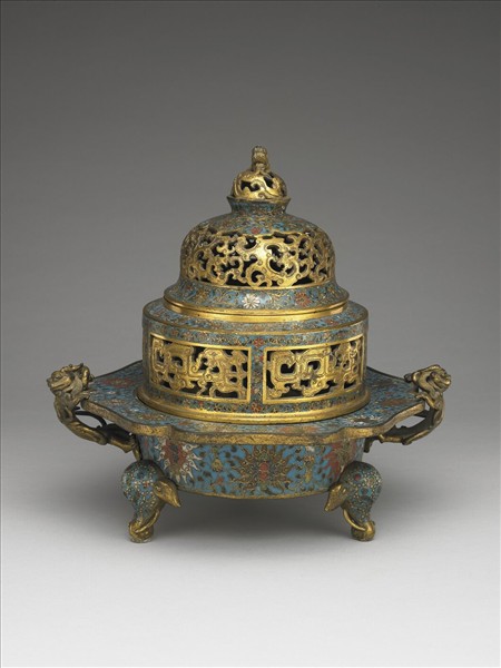 銅胎,全器分三部分,分別為蓋、圓桶狀組件,與器身,三部分可組合成爐。蓋雕異獸蹲踞為鈕,蓋面上下部分皆飾以掐絲藍地卷枝花,中央部分雕鏤雲紋;圓桶狀組件有四方形開光,開光內雕鏤拐子龍,開光外掐絲卷枝花卉;器身圓口折沿,折沿作六瓣花形,雙螭耳,三獸足,外壁掐絲卷枝番蓮,底外露胎,鏨刻單方框「景泰年製」雙行四字楷款。