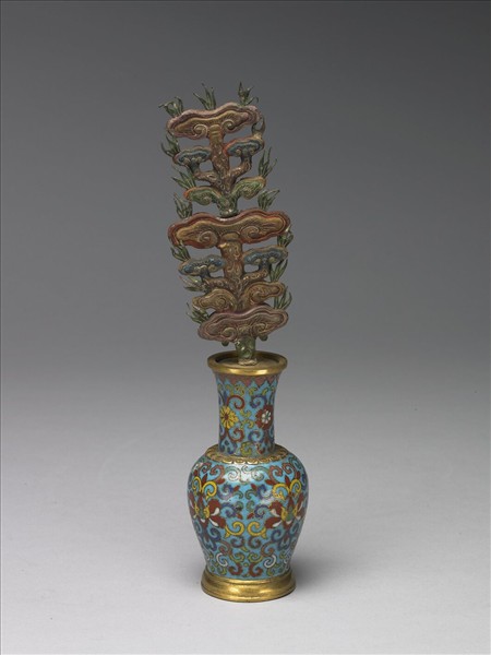 銅胎。敞口、長頸、斜肩、斂腹、矮圈足。全器以掐絲技法、琺瑯料填色製作紋飾,淺藍地,頸部飾葵花及菊花,器身飾番蓮紋,圈足露胎無紋。附銅膽及銅胎外髹色漆描金之靈芝。底部露胎,有陰刻「乾隆年製」二行楷書雙方框款。瓶為五供之一,本器與中琺193-中琺197成套。